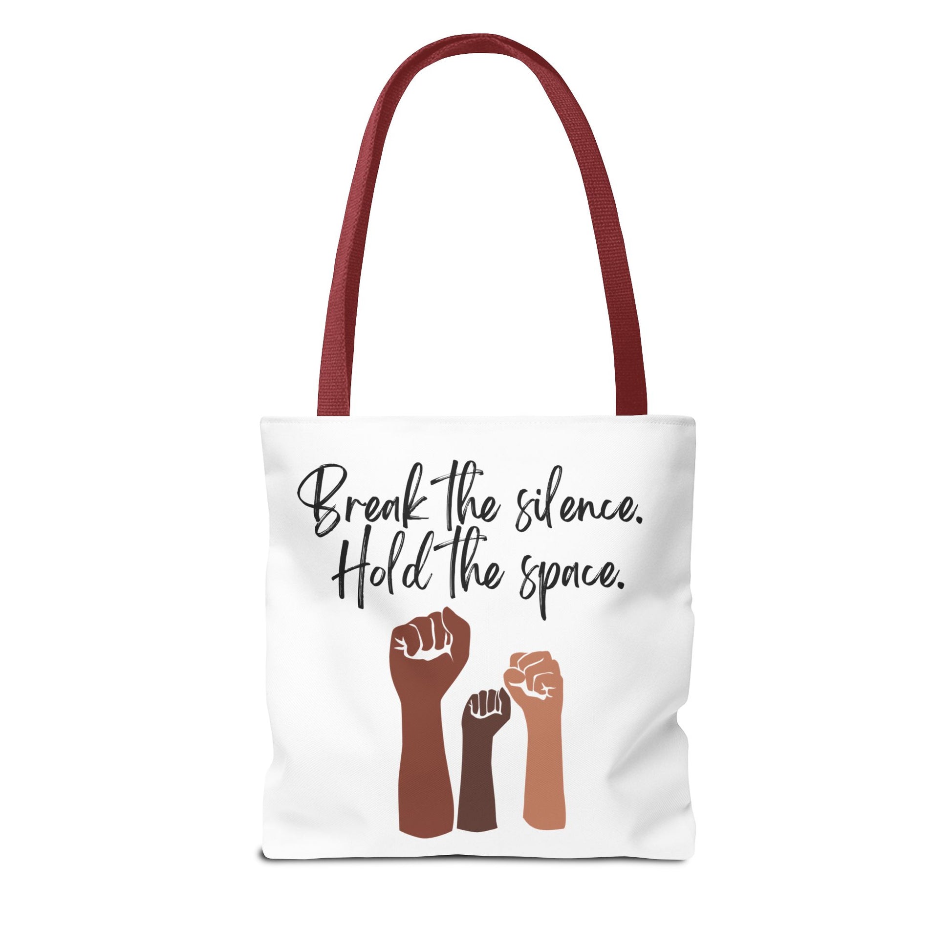 Introducing a chic and versatile Tote Bag, designed to make a statement wherever you go. This stylish yet practical accessory radiates empowerment with its inspiring message: "Break the silence. Hold the space." Perfect for carrying your essentials, it effortlessly complements casual outings, shopping trips, or a day at the beach. Ideal for anyone who values social justice and making their voice heard, this tote bag is a thoughtful gift for activists, friends, or family members celebrating occasions like Earth Day, International Women's Day, or simply spreading awareness year-round. With its durable polyester fabric and spacious interior, it's designed for everyday use while promoting a powerful message of unity and strength.